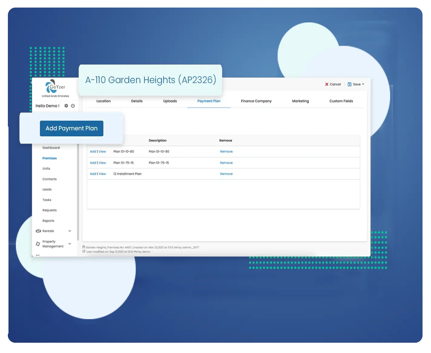 The Goyzer developer CRM software for real estate allows you to manage your day-to-day activities, property launches, payment plans, invoice receipts and their reminders along with a robust developer CRM that helps to keep track of all the contacts and leads in a single easy to use platform. The centralization of all your processes and documents allows managers to know the status and progress of their complete inventory and their sales cycle.